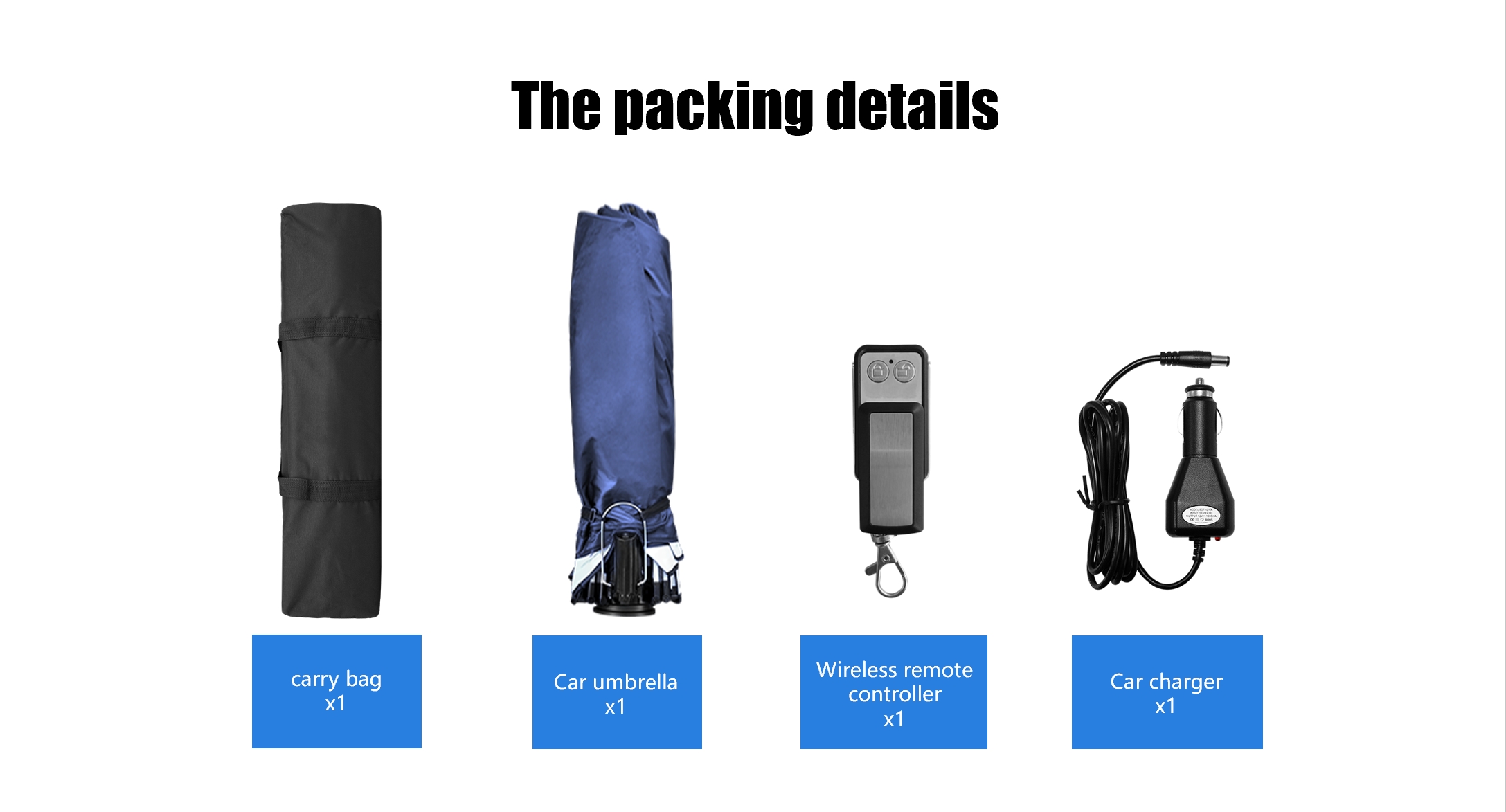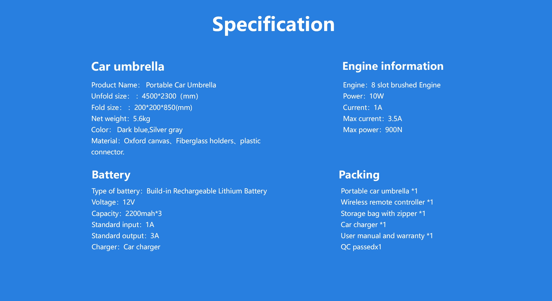 | Accesorios | 1 paraguas portátil para coche. Bolsa de almacenamiento con cremallera x1, Manual de usuario y tarjeta de garantía x1. |